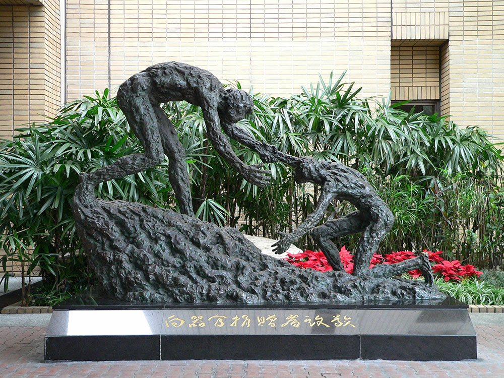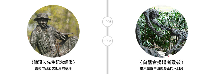 配合台大醫院百年慶典受託而塑造此作。作品把捐獻器官的犧牲者塑造為巨人與英雄,而把受贈者描述得軟弱無力,以突顯其精神的偉大及悲天憫人的人道精神。台坐上「向器官捐贈者致敬」的字跡亦為作者所書寫。作品置於台大醫院新大樓門口右側,人物的腳部現已被病人及民眾的手撫摸得有銅的亮光。