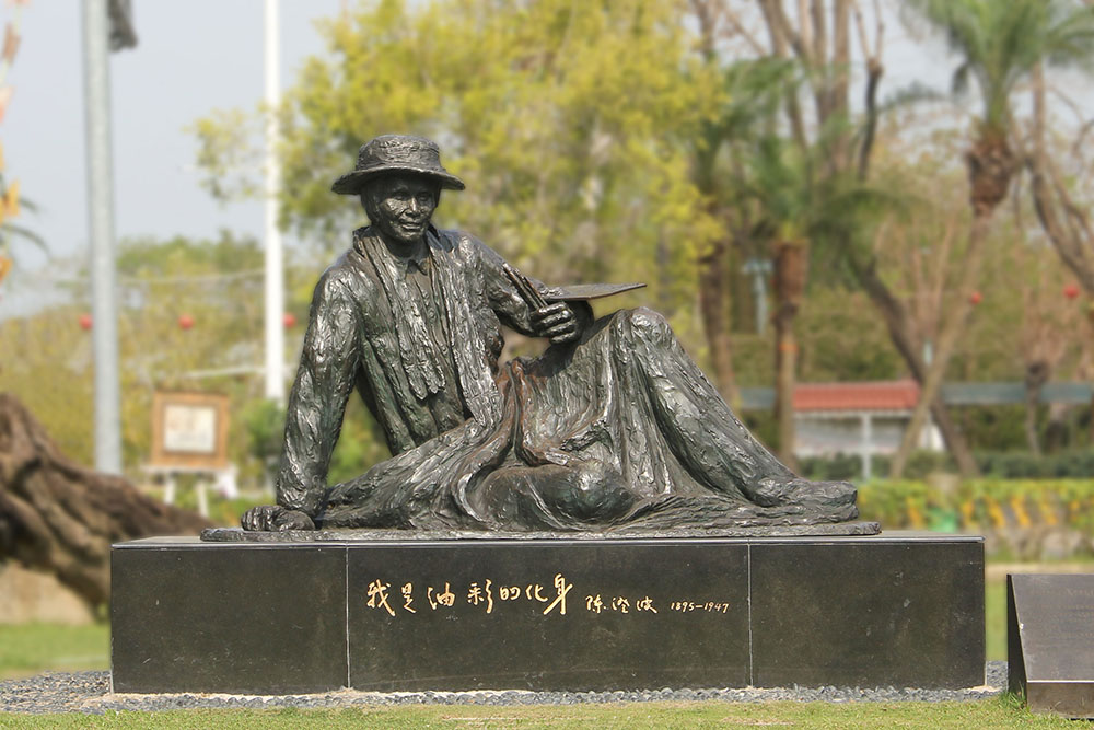 這件作品以陳澄波於杭州寫生所拍照的相片為藍本所創作的作品,他身穿一件沾滿油彩的工作服,手持調色盤,圍著圍巾,坐在草地上。
