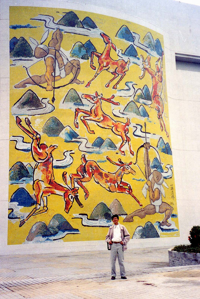 作品亮麗搶眼的鮮黃色天空,象徵嘉南平原的炫麗豐饒,三十二座小山丘環抱,兩名射箭的鄒族壯漢,身高約五百五十公分,和五隻各八百公分高的大梅花鹿追逐跳躍於其間,構圖呈現充滿律動的生命力,色彩鮮麗大膽。
