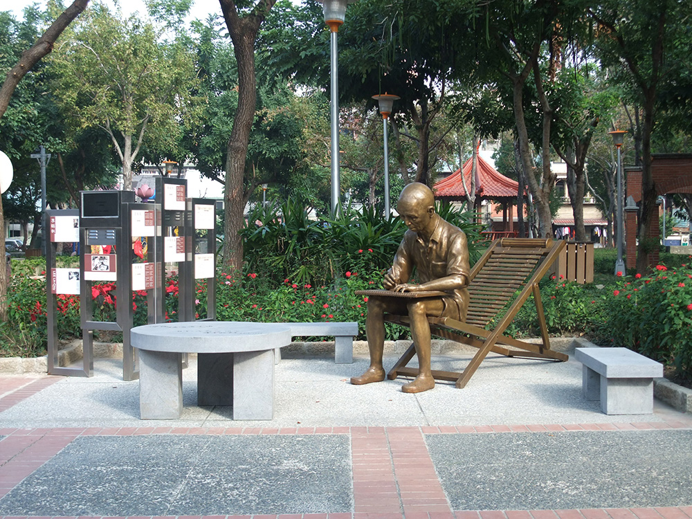 以李臨秋於大稻埕淡水河畔凝神寫詞的照片為藍本,周圍花圃種植李氏最喜愛的夜來香,鏤空屏風鑲嵌其生平簡介及經典歌詞之窯燒陶板,如〈望春風〉、〈四季紅〉、〈補破網〉等等,搭配定時音樂及影像播放,重現台灣一代歌謠詞人李臨秋文思泉湧的場景—「深夜、燒酒、夜來香」重現。
