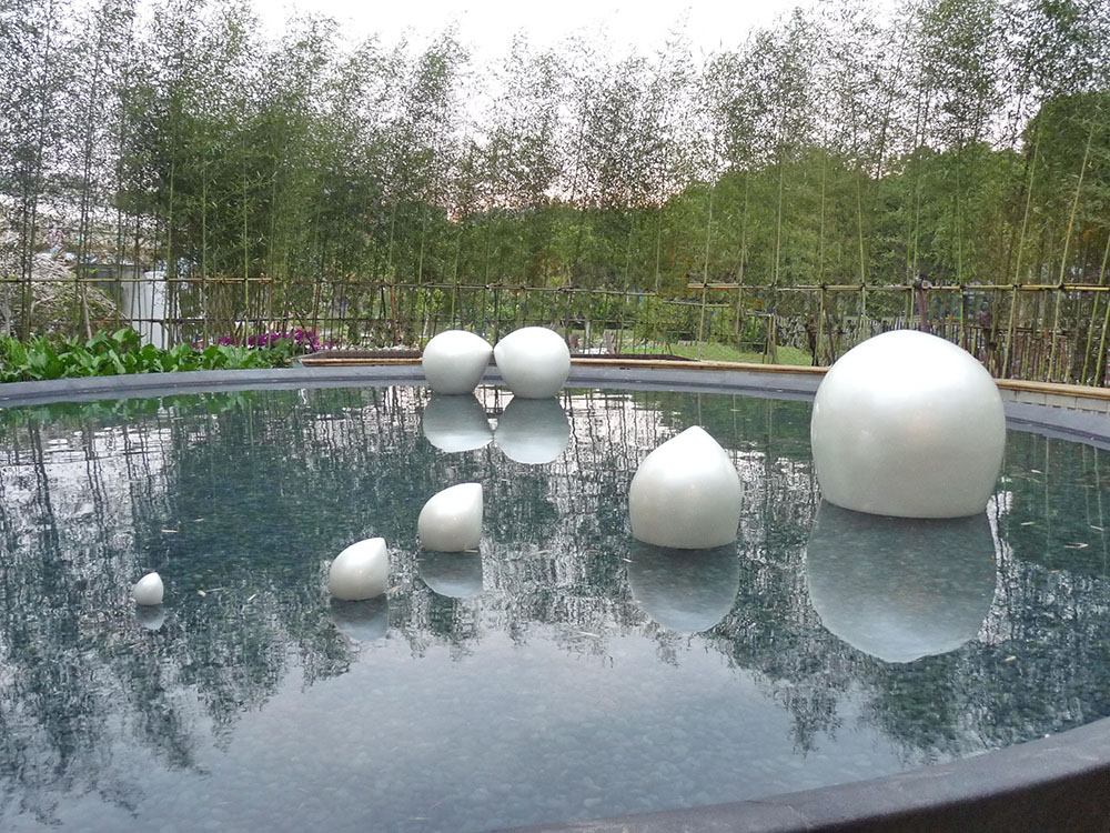 水,孕育生命,由水滴形狀轉化而來的《小水滴系列—散步》 、 《小水滴系列—親親》 ,搭配鏡面水池的倒影,白的讓人心靜,民眾可以坐下來靜靜聆聽風吹拂過竹林的窸窣聲,這一刻,美,好像被停格了。而空間佈置趣味性和藝術性,讓景觀雕塑的層次再次提升!