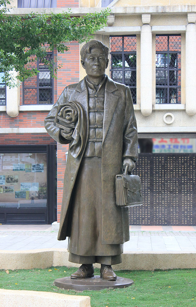 蔣渭水紀念銅像以1931年台灣民眾黨被解散後,蔣渭水(上圖)與幹部被拘捕後在黨部前的最後留影為設計藍本。這張影像最能呈現蔣渭水在人生最困頓的時候,仍是堅毅不拔、意氣風發的性格。